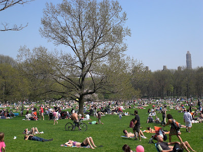 Dans mon post précédent je prévoyais que les New Yorkais allaient sortir le maillot de bain ce week end, et voilà, sans triche ni trucage (cela fait partie des règles de ma rubrique Manhattanite Insolite, zero trucage et photoshop!), je vous montre donc quelques photos de Central Park, hier vers 14 heures...